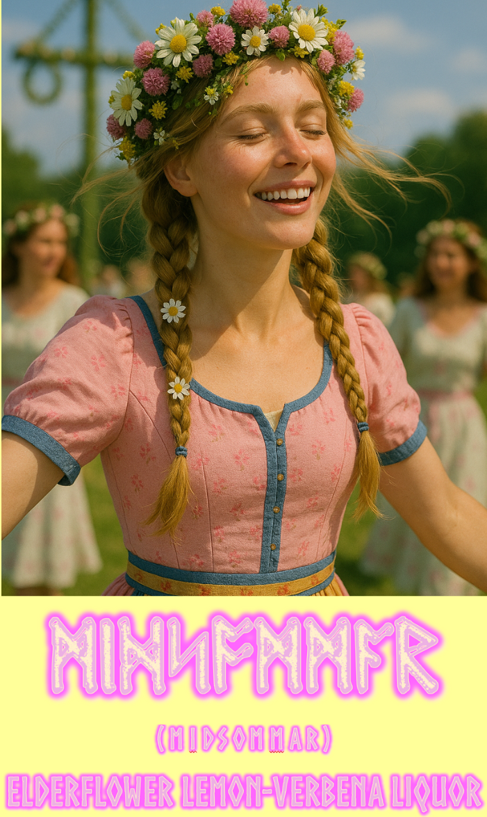 Midsommar: een frisse likeur op basis van vlierbloesem en citroenverbena. Deze is dan weer genoemd naar het midzomerfeest.